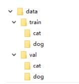 在很多机器学习或者深度学习的任务中,往往我们要提供自己的图片。也就是说我们的数据集不是预先处理好的,像mnist,cifar10等它已经给你处理好了,更多的是原始的图片。比如我们以猫狗分类为例。在data文件下,有两个分别为train和val的文件夹。然后train下是cat和dog两个文件夹,里面存的是自己的图片数据,val文件夹同train。这样我们的数据集就准备好了。