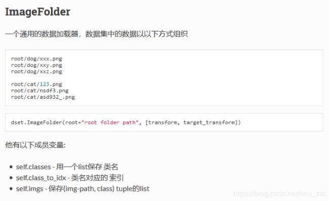 ImageFolder能够以目录名作为标签来对数据集做划分,下面是pytorch中文文档中关于ImageFolder的介绍: