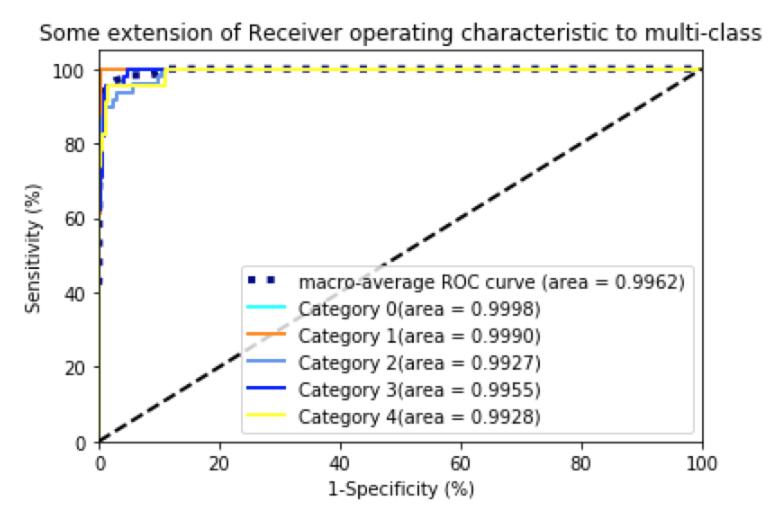 from scipy import interp # First aggregate all false positive rates all_fpr = np.unique(np.concatenate([fpr[i] for i in range(n_classes)])) # Then interpolate all ROC curves at this points mean_tpr = np.zeros_like(all_fpr) for i in range(n_classes): mean_tpr += interp(all_fpr, fpr[i], tpr[i]) # Finally average it and compute AUC mean_tpr /= n_classes fpr["macro"] = all_fpr tpr["macro"] = mean_tpr roc_auc["macro"] = auc(fpr["macro"], tpr["macro"])