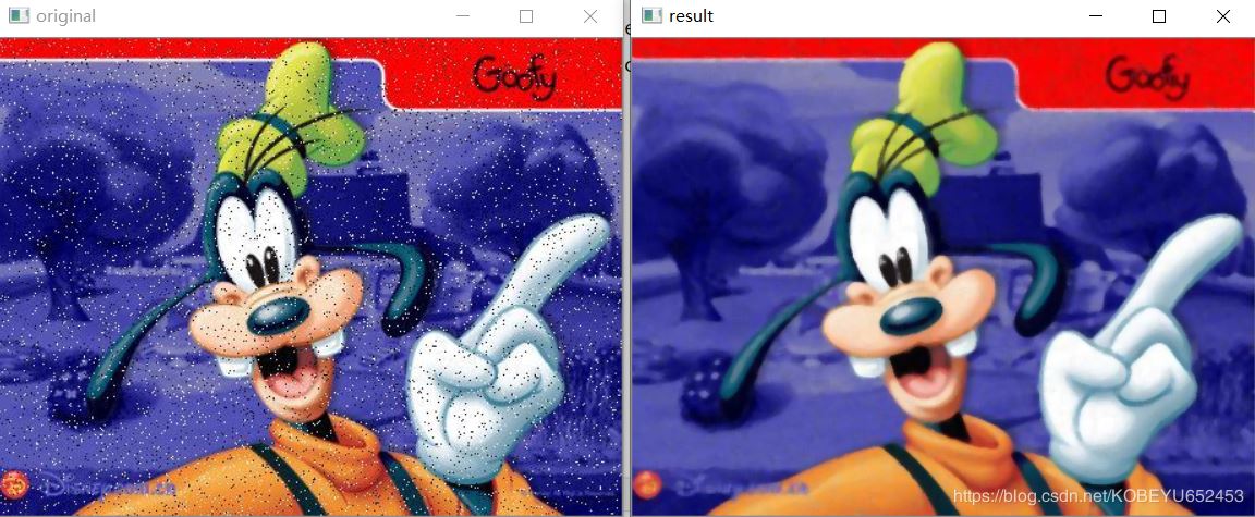 效果:使图像变模糊啦。能处理被椒盐攻击过的照片。
