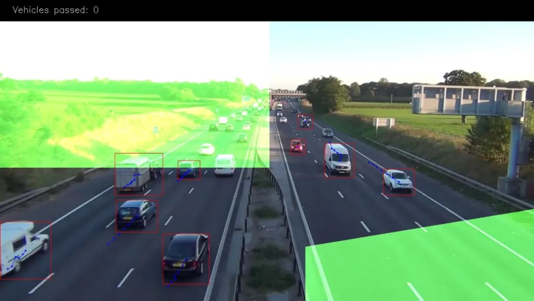 上面的图像中绿色的部分是出口区域。我们在这里对车辆进行计数,只有当车辆移动的长度超过3个点我们才进行计算