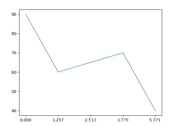 from math import pi import matplotlib.pyplot as plt cat = ['Speed', 'Reliability', 'Comfort', 'Safety', 'Effieciency'] values = [90, 60, 65, 70, 40] N = len(cat) x_as = [n / float(N) * 2 * pi for n in range(N)] ax = plt.subplot(111) plt.xticks(x_as) ax.plot(x_as, values, linewidth=1, linestyle='solid', zorder=3) plt.show()
