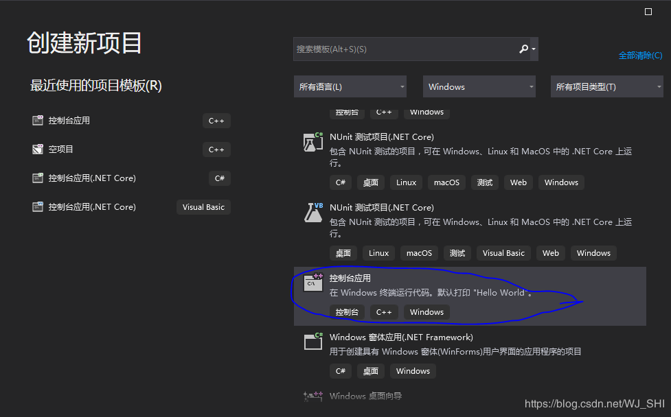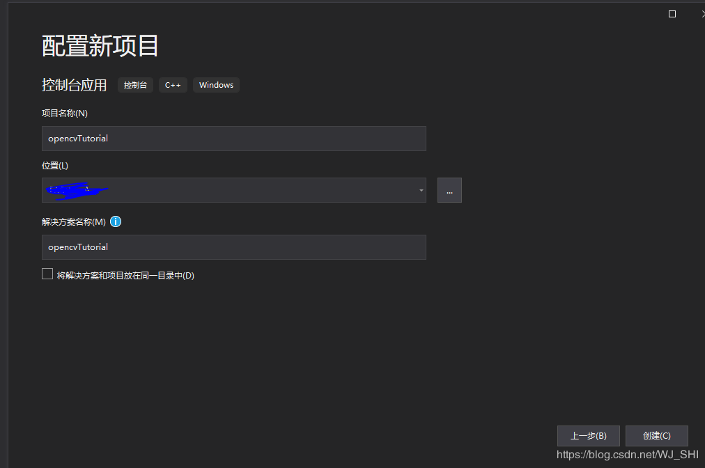现在万事俱备,只欠…啥也不欠了,接下来就打开visual studio创建一个基本的C++项目,然后更改一些配置就可以写opencv代码了。点击创建新项目,找到C++控制台应用(空项目也可以),并输入一个项目名称和项目地址,如下两步:
