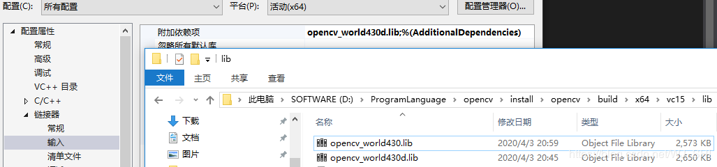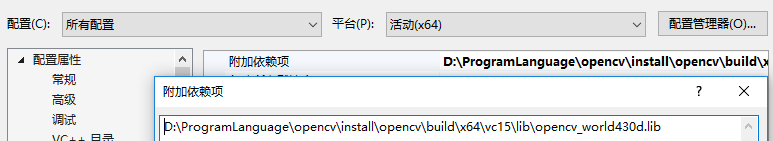 那么接下来就愉快的写代码吧,哦,不,还有最后一步。配置链接器中的附加依赖项,附加依赖项就是和bin文件夹同地址中的lib文件夹中的“opencv_worldxxxd.lib"文件,其中xxx表示版本(如4.30版本,则xxx为430,后面的d表示debug),如果是release版的话,把d去掉即可。