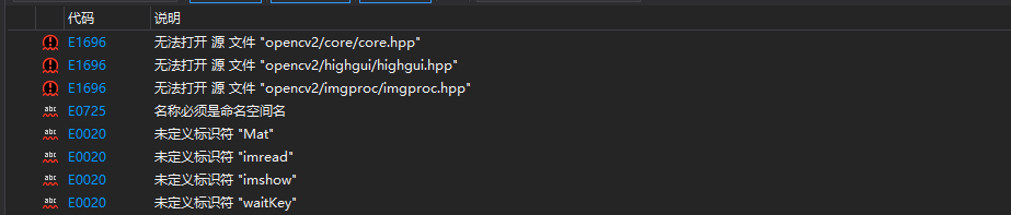 把这些头文件都包含好了之后,再通过using namespace cv把cv名空间引入就行了(或者在每需要使用到cv库里的对象或函数时都在前面加一个cv::也行)。