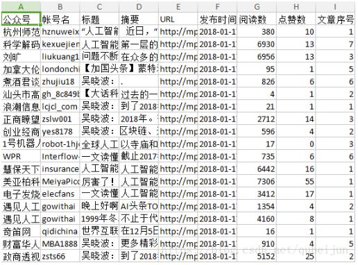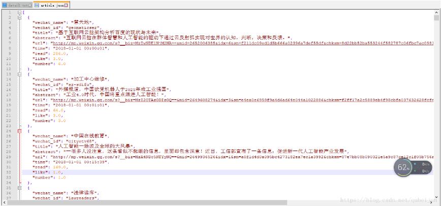 # 微信文章属性:wechat_name wechat_id title abstract url time read like number