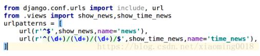 urlpatterns 里的include为子路由分发。主路由的urlpatterns里的url(r'^news/',include('news.urls',namespace="news")) news为应用模块