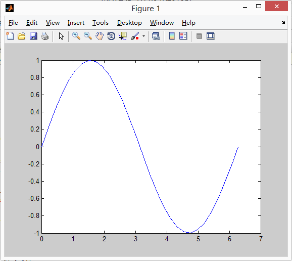 >> x=linspace(0,2*pi,30); % 生成一组线性等距的数值 >> y=sin(x); >> plot(x,y)