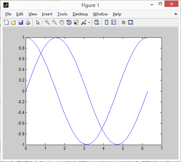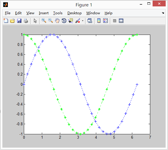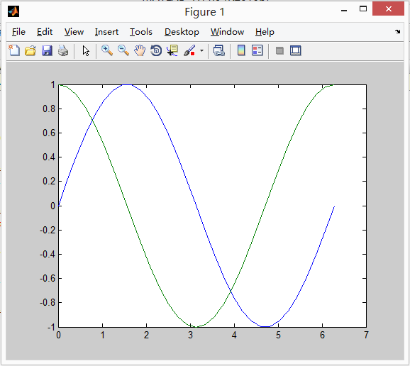 >> x=0:pi/15:2*pi; >> y1=sin(x); >> y2=cos(x); >> plot(x,y1,x,y2)