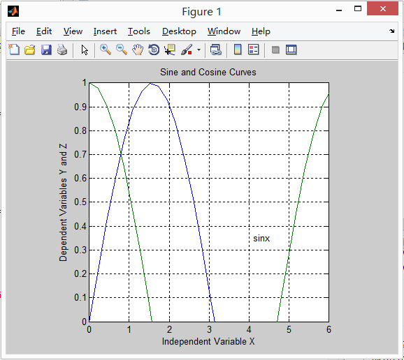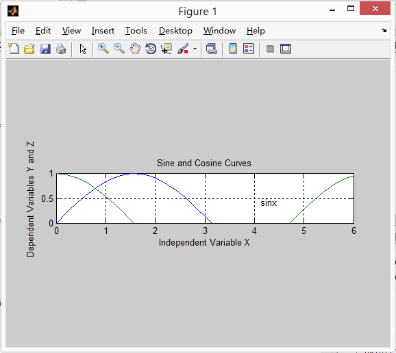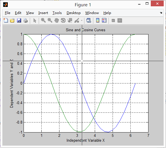 >> x=linspace(0,2*pi,30); y=sin(x); z=cos(x); >> plot(x,y,x,z) >> grid%网格 >> xlabel(‘Independent Variable X')%x轴标记 >> ylabel(‘Dependent Variables Y and Z')%y轴标记 >> title(‘Sine and Cosine Curves')%标题