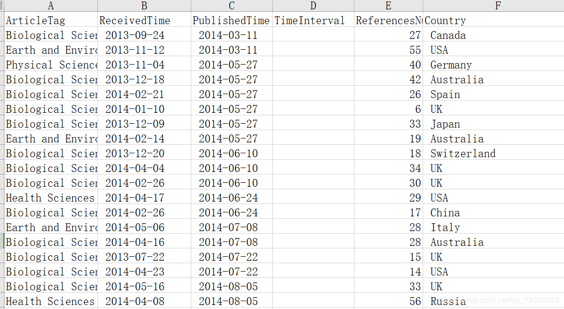 import pandas as pd import datetime #用来计算日期差的包 def dataInterval(data1,data2): d1 = datetime.datetime.strptime(data1, '%Y-%m-%d') d2 = datetime.datetime.strptime(data2, '%Y-%m-%d') delta = d1 - d2 return delta.days def getInterval(arrLike): #用来计算日期间隔天数的调用的函数 PublishedTime = arrLike['PublishedTime'] ReceivedTime = arrLike['ReceivedTime'] # print(PublishedTime.strip(),ReceivedTime.strip()) days = dataInterval(PublishedTime.strip(),ReceivedTime.strip()) #注意去掉两端空白 return days if __name__ == '__main__': fileName = "NS_new.xls"; df = pd.read_excel(fileName) df['TimeInterval'] = df.apply(getInterval , axis = 1)