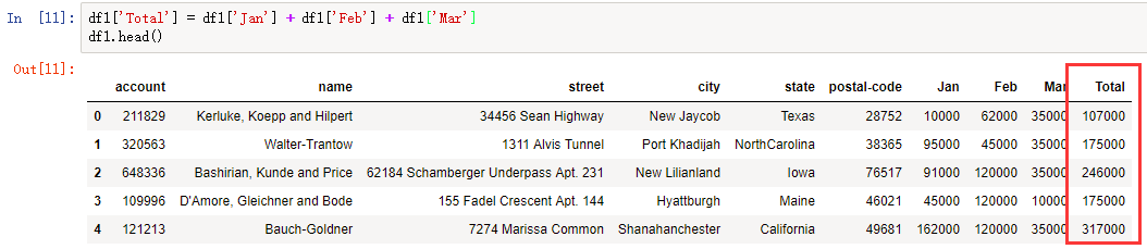 # 由于是创建,不能使用 df.Total df1['Total'] = df1['Jan'] + df1['Feb'] + df1['Mar']