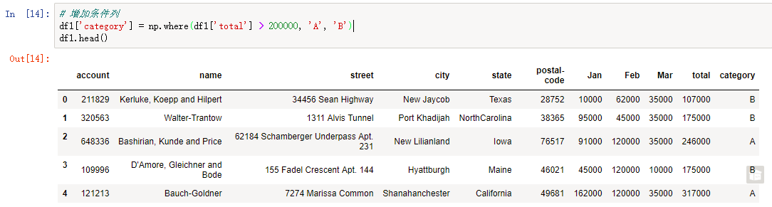假设现在要根据合计数 (Total 列),当 Total 大于 200,000 ,类别为 A,否则为 B。在 Excel 中实现用的是 IF 函数,但在 pandas 中需要用到 numpy 的 where 函数: