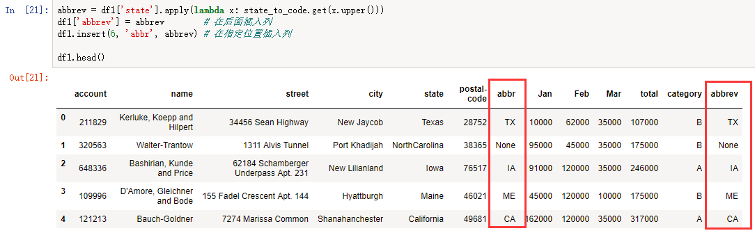 abbrev = df1['state'].apply(lambda x: state_to_code.get(x.upper())) df1['abbrev'] = abbrev # 在后面插入列 df1.insert(6, 'abbr', abbrev) # 在指定位置插入列