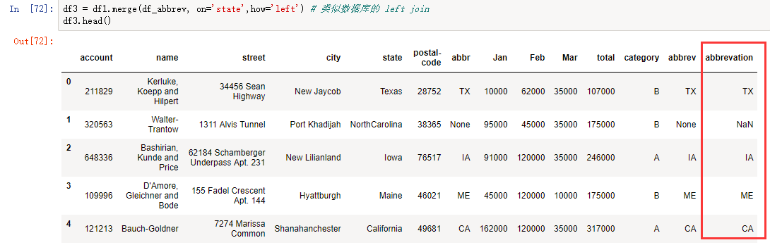 df3 = df1.merge(df_abbrev, on='state', how='left') # 类似数据库的 left join