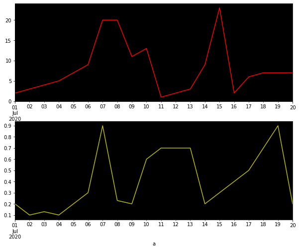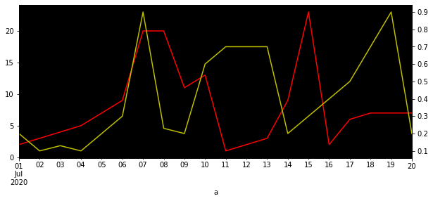 data['c'].plot(ax = ax_1.twinx(),color = 'y')