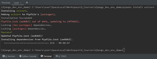 安装 uvicorn 非常简单,首先打开 PyCharm 的 Terminal,PyCharm 会自动帮我们激活项目关联的虚拟环境,所有命令将在虚拟环境执行,非常方便。执行 pipenv install uvicorn 安装 uvicorn 就可以了。
