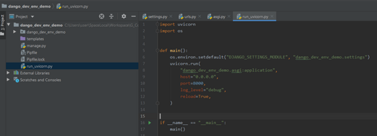 然后就是 uvicorn.run 启动 django。更确切点地说就是启动一个 ASGI 或者 WSGI 应用。django 3 以后逐渐支持 ASGI 应用,而在此之前则是 WSGI。第一个参数传入 ASGI 或者 WSGI 应用所在的模块。例如这里的 django_dev_env_demo.asgi:application 表示 django_dev_env_demo 下 asgi.py 模块里的 application(django 提供的 ASGI 应用的实例),在 django_dev_env_demo/asgi.py 下可以看到。如果是 django 3.0 以前版本,相应改为 WSGI application 所在模块即可。