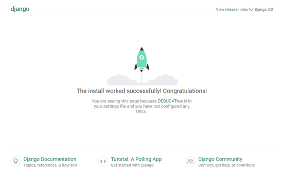 说明应用已在 8000 端口启动,现在访问 localhost:8000,可以看到熟悉的 django 项目初始页面。