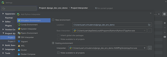 Location配置项会让你选择项目位置,例如我要在 C:\Users\user\SpaceLocal\Workspace\G_Courses\ 目录下创建一个名为 django_dev_env_demo 的项目,就填写 C:\Users\user\SpaceLocal\Workspace\G_Courses\django-dev-env-demo 。