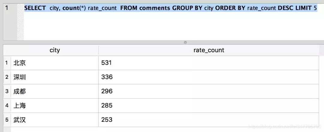 因为前文我们是使用数据库来进行数据存储的,因此可以直接使用 SQL 来查询自己想要的结果,比如评论前五的城市都有哪些:
