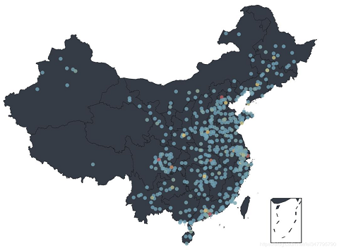 注:使用 Pyecharts 提供的数据地图中,有一些猫眼数据中的城市找不到对应的从标,所以在代码中,GEO 添加出错的城市,我们将其直接删除,过滤掉了不少的数据。