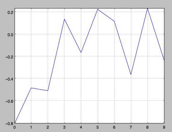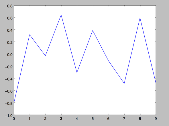 import numpy as np import matplotlib as mpl import matplotlib.pyplot as plt np.random.seed(1000) y = np.random.standard_normal(10) print "y = %s"% y x = range(len(y)) print "x=%s"% x plt.plot(y) plt.show()