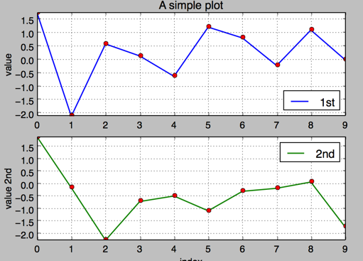 np.random.seed(2000) y = np.random.standard_normal((10, 2)).cumsum(axis=0) #10行2列 在这个数组上调用cumsum 计算赝本数据在0轴(即第一维)上的总和 print y
