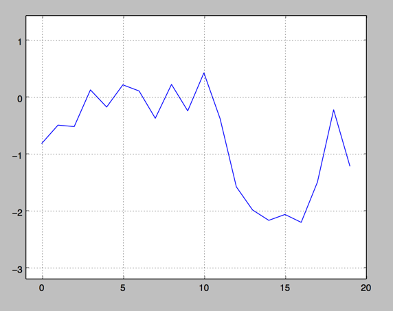 #!/etc/bin/python #coding=utf-8 import numpy as np import matplotlib as mpl import matplotlib.pyplot as plt np.random.seed(1000) y = np.random.standard_normal(20) plt.plot(y.cumsum()) plt.grid(True) ##增加格点 plt.xlim(-1,20) plt.ylim(np.min(y.cumsum())- 1, np.max(y.cumsum()) + 1) plt.show()