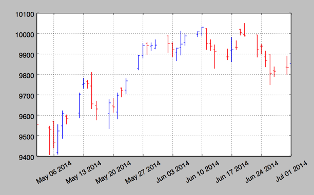 mpf.plot_day_summary(ax, quotes, colorup='b',colordown='r')