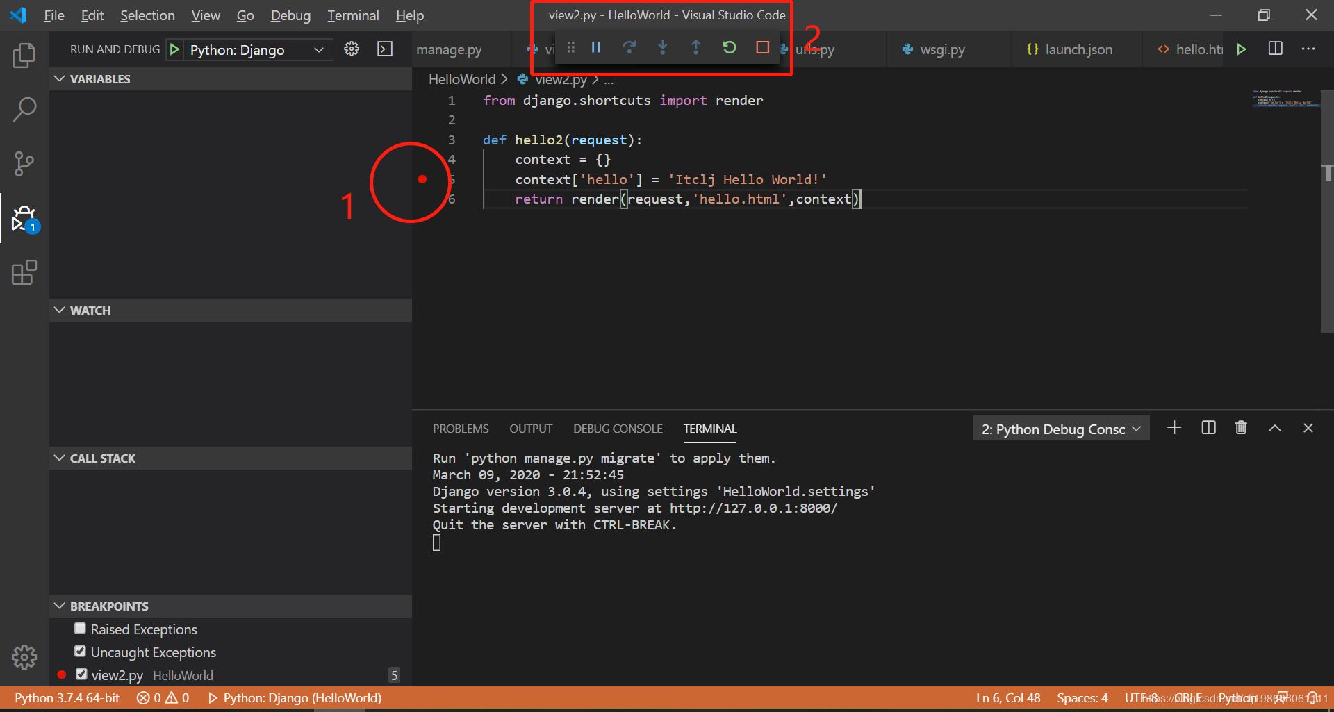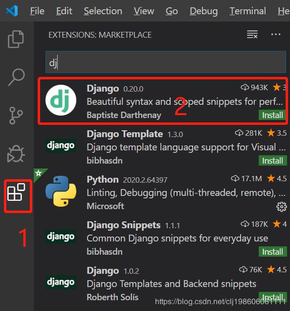进入vscode 先下载django,点击左侧最下面图标,搜索Django,点击下图2的位置的install