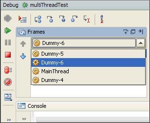 对于多线程程序来说,通常会有多个线程,当需要 debug 的断点分别设置在不同线程对应的线程体中的时候,通常需要 IDE 有良好的多线程调试功能的支持。 Pycharm 中在主线程启动子线程的时候会自动产生一个 Dummy 开头的名字的虚拟线程,每一个 frame 对应各自的调试帧。如图 5,本实例中一共有四个线程,其中主线程生成了三个线程,分别为 Dummy-4,Dummy-5,Dummy-6. 其中 Dummy-4 对应线程 1,其余分别对应线程 2 和线程 3。