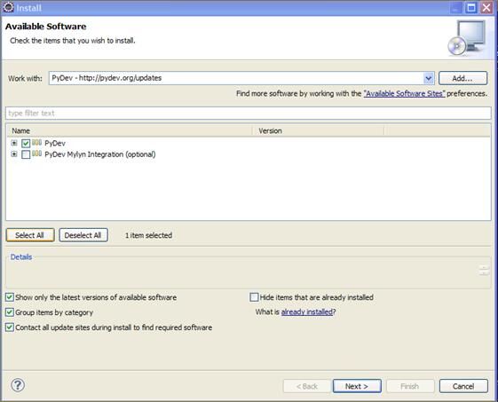 PyDev 是一个开源的的 plugin,它可以方便的和 Eclipse 集成,提供方便强大的调试功能。同时作为一个优秀的 Python IDE 还提供语法错误提示、源代码编辑助手、Quick Outline、Globals Browser、Hierarchy View、运行等强大功能。下面讲述如何将 PyDev 和 Eclipse 集成。在安装 PyDev 之前,需要先安装 Java 1.4 或更高版本、Eclipse 以及 Python。 第一步:启动 Eclipse,在 Eclipse 菜单栏中找到 Help 栏,选择 Help > Install New Software,并选择 Add button,添加 Ptdev 的下载站点 http://pydev.org/updates。选择 PyDev 之后完成余下的步骤便可以安装 PyDev。