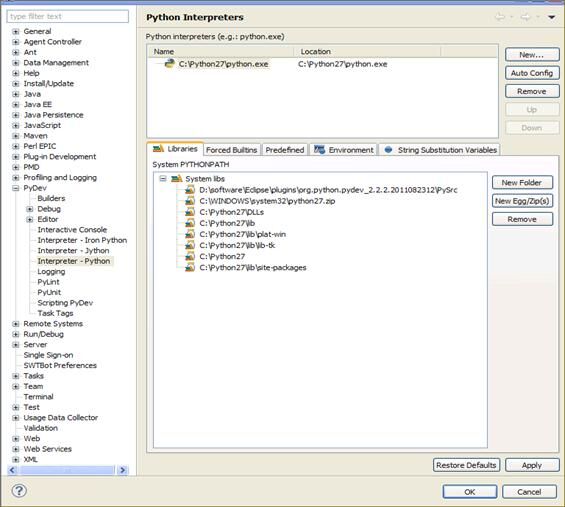 安装完成之后需要配置 Python 解释器,在 Eclipse 菜单栏中,选择 Window > Preferences > Pydev > Interpreter – Python。Python 安装在 C:\Python27 路径下。单击 New,选择 Python 解释器 python.exe,打开后显示出一个包含很多复选框的窗口,选择需要加入系统 PYTHONPATH 的路径,单击 OK。