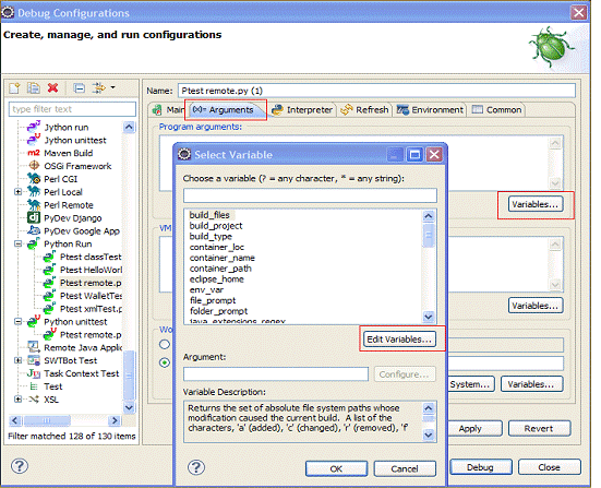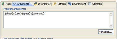 在调试的时候有些情况需要传入一些参数,在调试之前需要进行相应的配置以便接收所需要的参数,选择需要调试的程序(本例 remote.py),该脚本在 debug 的过程中需要输入四个参数:host,user,password 以及命令。在 eclipse 的工程目录下选择需要 debug 的程序,单击右键,选择“Debug As”->“Debug Configurations”,在 Arguments Tab 页中选择“Variables”。如下 图 9 所示 .