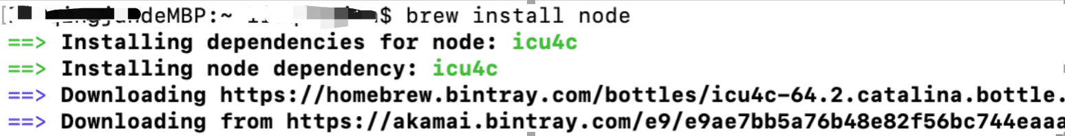 步骤二:在命令行输入 “brew install node” ,用来安装nodejs和npm程序,如下图所示: