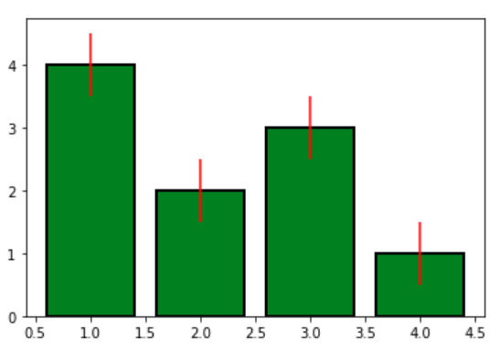 plt.bar(x = [1, 2, 3, 4], height = [4, 2, 3, 1], width = 0.8, edgecolor = 'black', linewidth = 2, align = 'center', color = 'g', yerr = 0.5, ecolor = 'r')