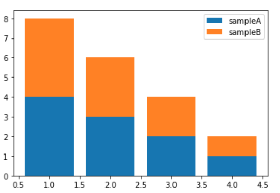 plt.bar(x = [1, 2, 3, 4], height = [4, 3, 2, 1], label = 'sampleA') plt.bar(x = [1, 2, 3, 4], height = [4, 3, 2, 1], bottom = [4, 3, 2, 1], label = 'sampleB') plt.legend()