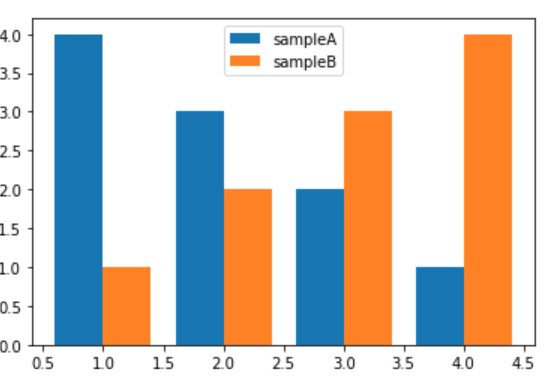 width = 0.4 plt.bar(x = np.array([1, 2, 3, 4]) - width / 2, height = [4, 3, 2, 1], width = width, label = 'sampleA') plt.bar(x = np.array([1, 2, 3, 4]) + width / 2, height = [1, 2, 3, 4], width = width, label = 'sampleB') plt.legend()