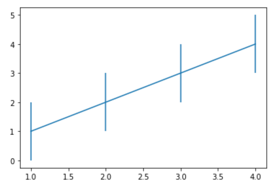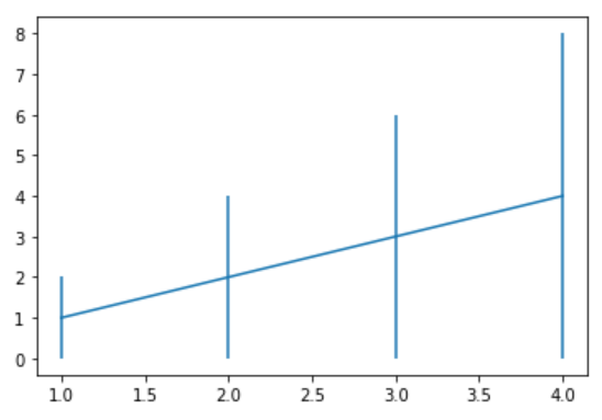 plt.errorbar(x=[1, 2, 3, 4], y=[1, 2, 3, 4], yerr=[1, 2, 3, 4])