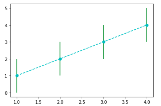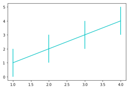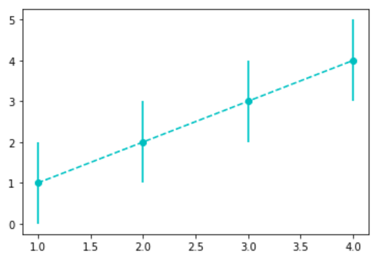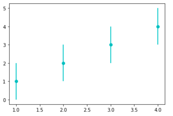plt.errorbar(x=[1, 2, 3, 4], y=[1, 2, 3, 4], yerr=1, fmt='c')