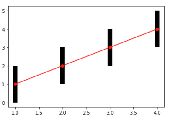 plt.errorbar(x=[1, 2, 3, 4], y=[1, 2, 3, 4], yerr=1, fmt='ro-',ecolor='k',elinewidth=10)