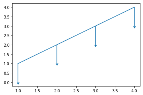 plt.errorbar(x=[1, 2, 3, 4], y=[1, 2, 3, 4], yerr=1, lolims=True)