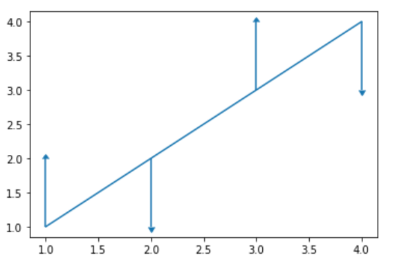 plt.errorbar(x=[1, 2, 3, 4], y=[1, 2, 3, 4], yerr=1, uplims=[False, True, False, True], lolims=[True, False, True, False])