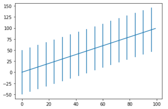 plt.errorbar(x=range(100), y=range(100),yerr=50)