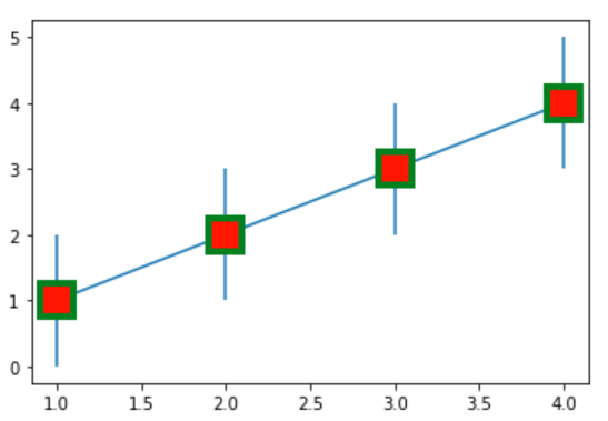 plt.errorbar(x=[1, 2, 3, 4], y=[1, 2, 3, 4], yerr=1, marker='s', mfc='red', mec='green', ms=20, mew=4)