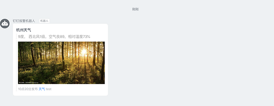 "text": "#### 杭州天气 \n > 9度, 西北风1级,空气良89,相对温度73%\n\n > \n > ###### 10点20分发布 [天气](http://www.thinkpage.cn/) test"