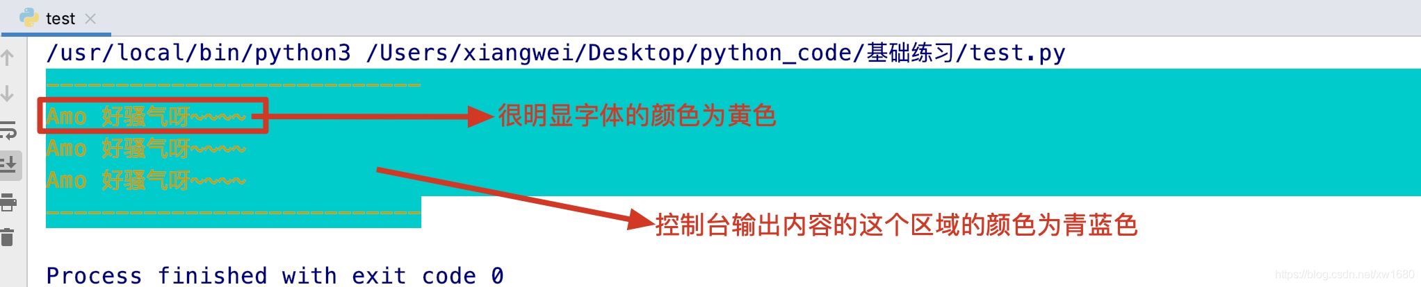那么,如何使PyCharm中输出的内容,有不同的背景色和字体颜色?其实非常的简单,我们只需要在print输出语句中进行一些简单的设置即可,在PyCharm控制台中设置字体和背景色,需要使用下面语法: