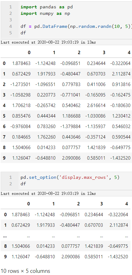 在修改display.max_rows的参数值之后,我们的数据框只会显示指定行数的数据,中间的部分都会以省略号的形式显示,当我们的数据框行数较多,可以加大这个参数以显示更多行数据。