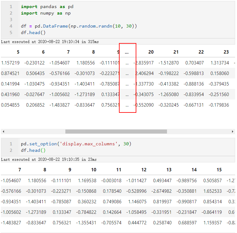 类似display.max_rows,通过修改display.max_columns我们可以调节最大显示的数据框列数(默认是20列),这在我们的数据框字段较多又想全部查看的时候很有用:
